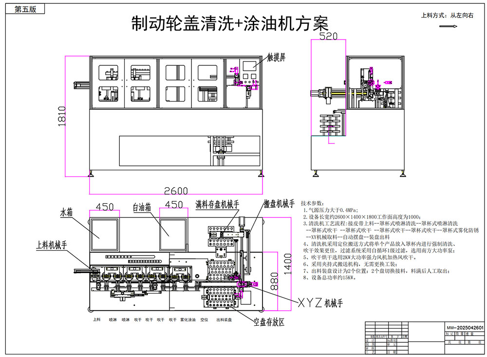 工藝流程:磨床出料傳送機把料放到指定位置→上料機械手取料進入清洗機(機械手自動上料)→罩杯定位噴淋清洗→罩杯定位噴淋清洗→罩杯強制吹干→熱風吹干(加熱)→罩杯定位霧化涂油→出料(X\Y軸機械自動到鏈條上取料放入整列盤內)。