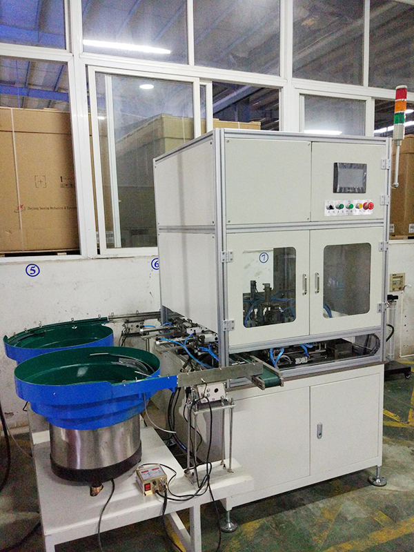 振動盤自動認面→PU皮帶送料→夾持機構搬送→光纖檢測→自動注脂→自動勻脂→NG排出→OK品出料